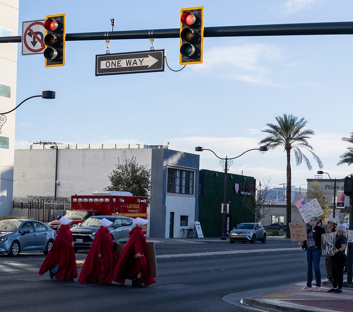 The Handmaids of Las Vegas hosted an ICE Out protest in front of ICE Headquarters in Las Vegas, NV. The protest took place on Friday, March 6, 2026.